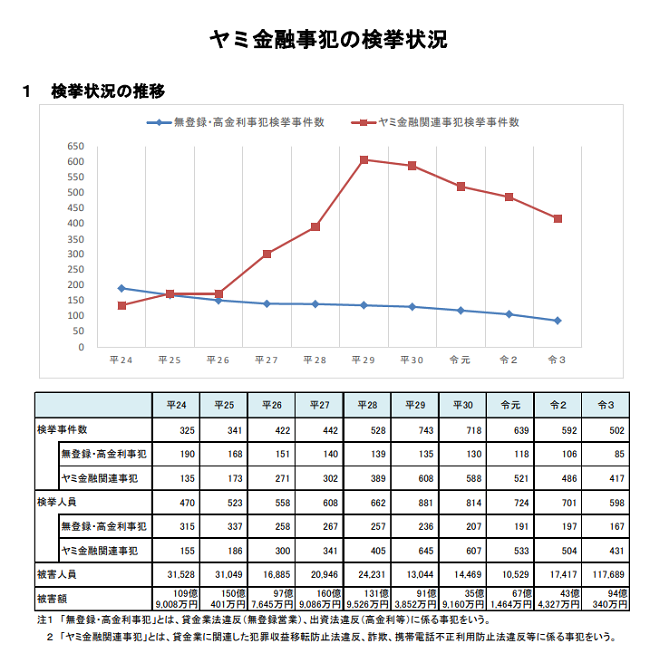 令和3年には、闇金に関わる事件の検挙数は500件以上ありました。